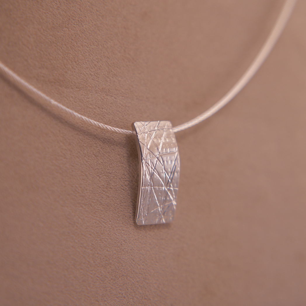 Leicht gewölbter Sterling Silber Anhänger mit vielen glänzenden Pfaden und matter, unebener Oberfläche. Besonders behandelte Oberfläche schimmert seiden während ungeordnet verlaufende, polierte Kerben im Licht funkeln. Abgerundete Ecken und glanzpolierte Seiten vollenden das Design. Die Öse befindet sich auf der Rückseite des schönen Anhängers, und mit 3,5 mm Breite ist sie für dünne Kettchen oder Bändchen (nicht im Lieferumfang enthalten) entworfen. Ausführung mit einem Collier finden Sie hier.