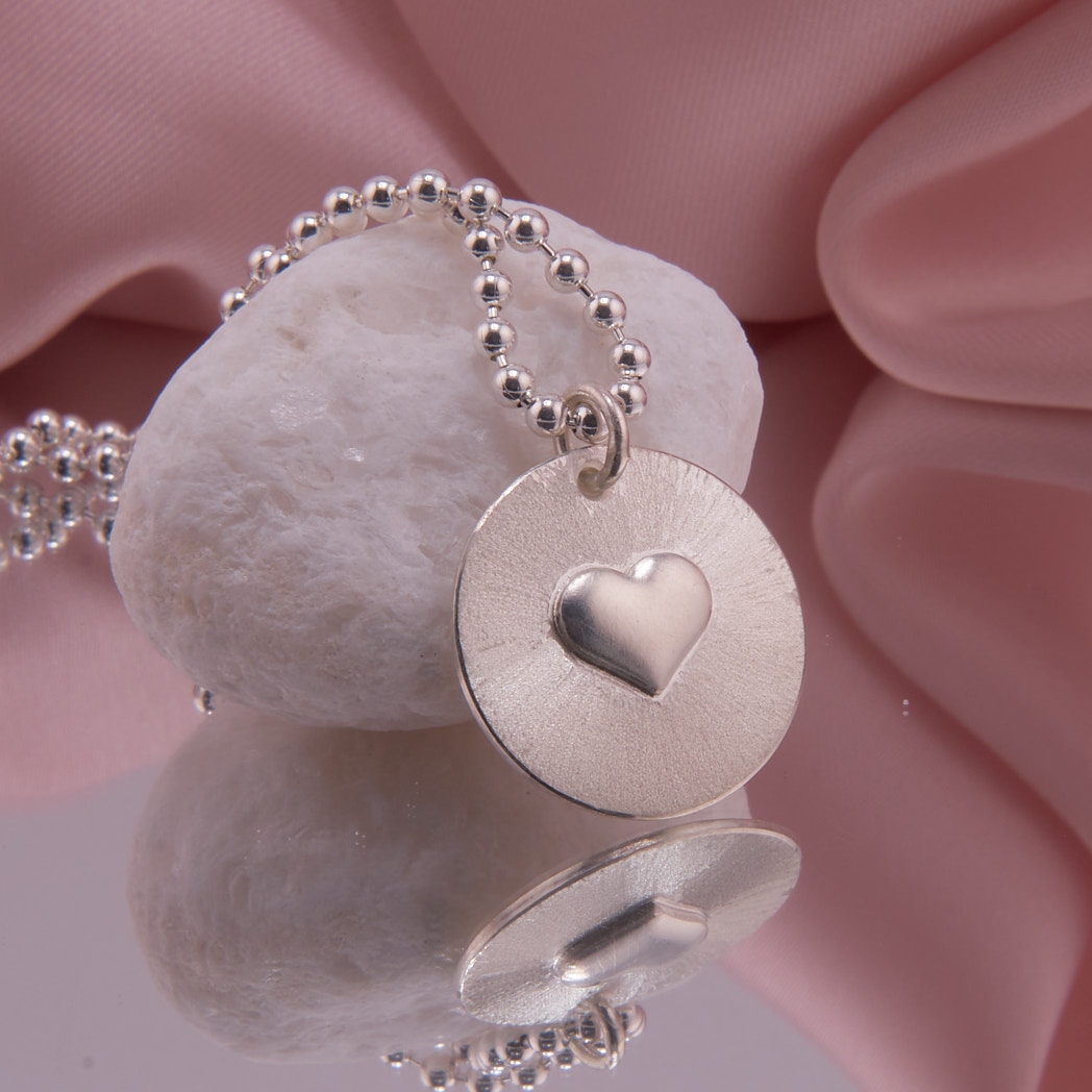 Handgefertigter, runder Sterling Silber Kettenanhänger mit mittig angeordnetem Herz und diamantierter Oberfläche. Ein glitzerndes Finish sorgt für strahlende Wirkung. Ausführung inkl. Kette finden Sie hier.