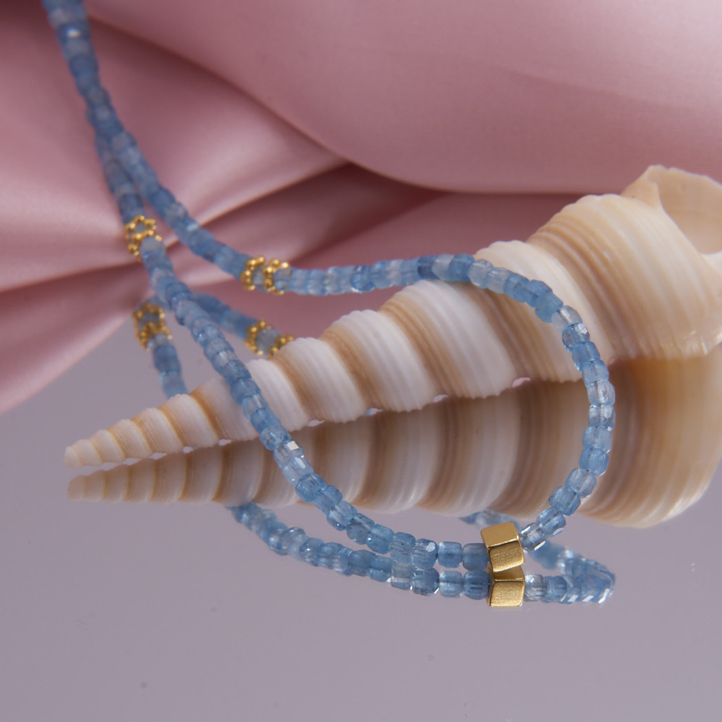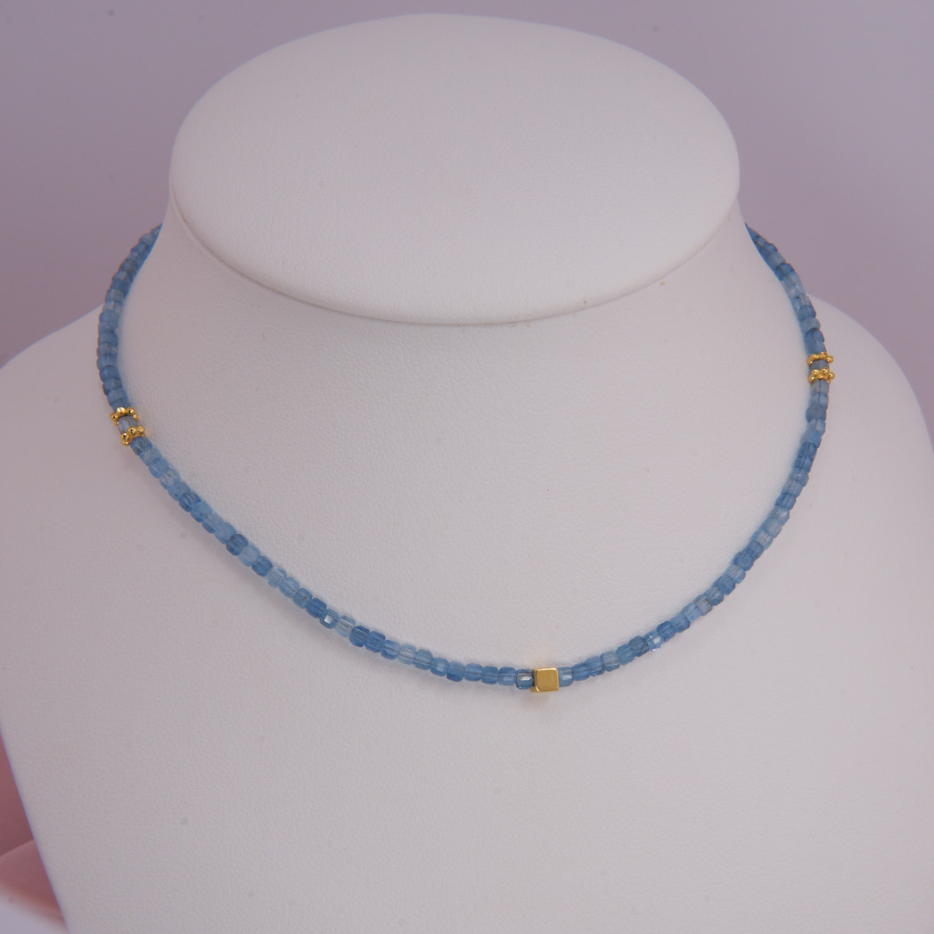 Filigrane Aquamarin Halskette mit vergoldeten Sterling Silber Verschlüssen, Zwischenteilen und Verlängerungskette. Moderne Würfelform der facettierten Edelsteine. Maritime, leuchtende Farben, Zwischenteile aus vergoldetem Sterling Silber. Ein minimalistisches Design, sportlich-elegant. Auch als Layering Kette geeignet.