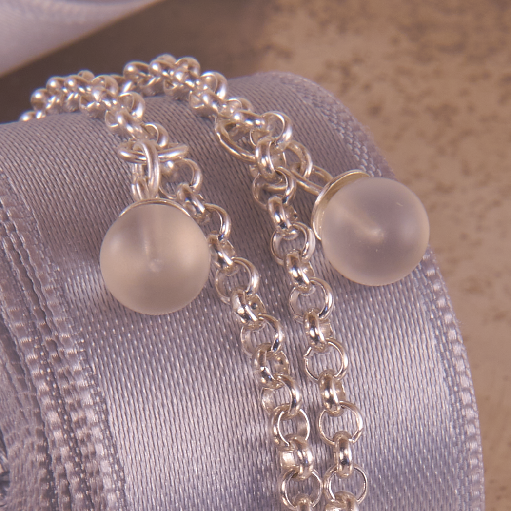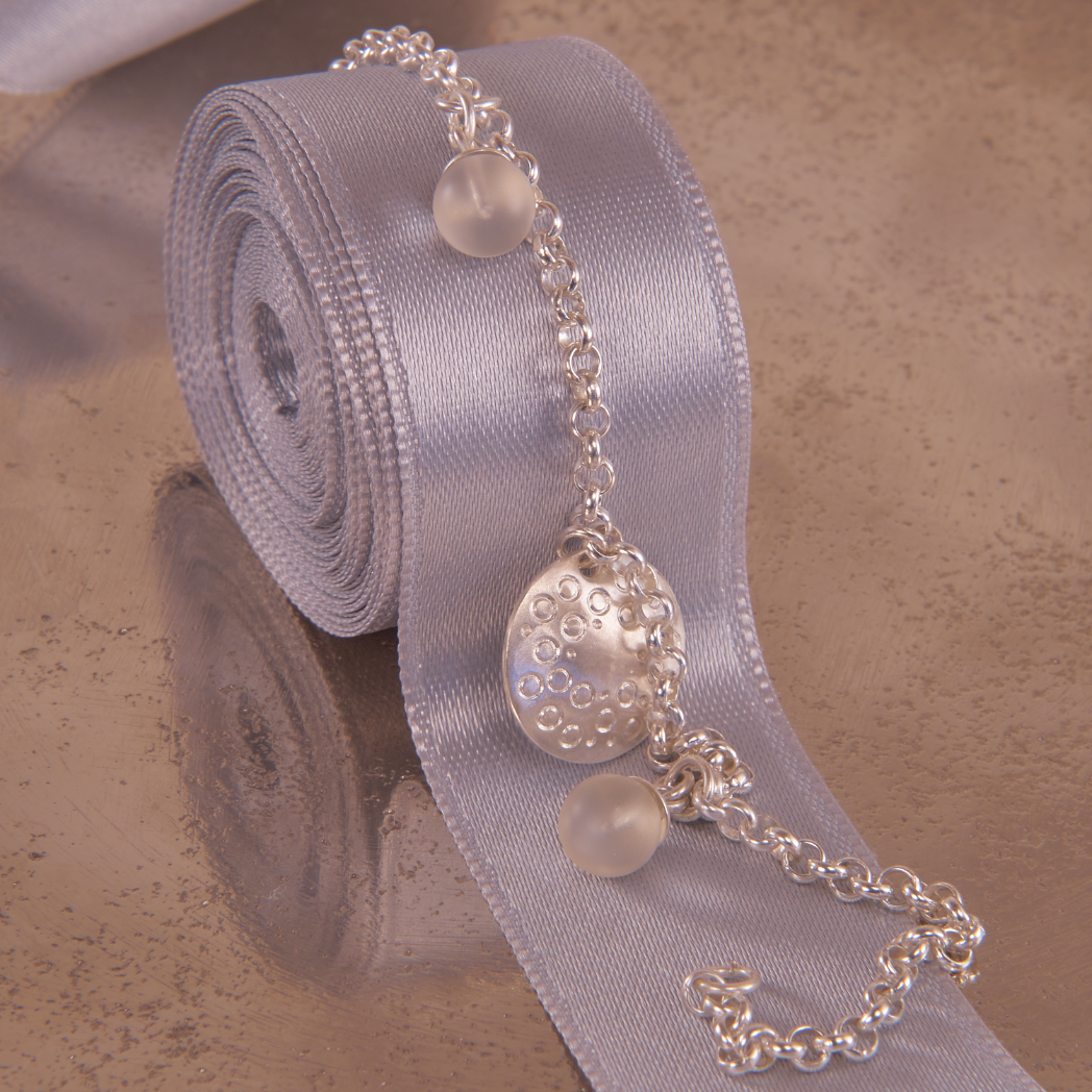 Armband aus Sterling Silber mit Edelsteinen und konvex gebogenem Anhänger. Asymmetrisch angeordnete Ornamente verleihen dem kleinen Silberronde eine verspielte Note. Zwei kleine, matt geschliffene Bergkristalle unterstreichen die Ornamentformen und passen sich der matt gebürsteten Oberfläche des kleinen Anhänger an. Die Rückseite des Anhängers ist glatt poliert. Alle Elemente sind auf einer 3,2 mm starken Erbskette mit Federringverschluss angeordnet. Farblich neutral gehalten passt das Armband zu jedem Outfit und kann gut mit anderen Schmuckstücken kombiniert werden.