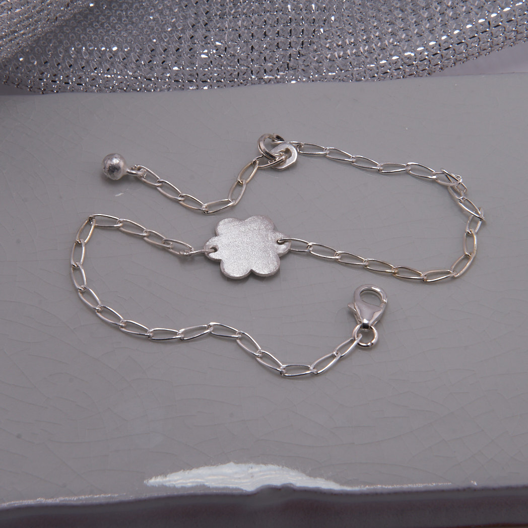 Sterling Silber Langpanzer Armband mit einer mittig angeordneten, feinschimmernden Silberblume. Mit Karabinerverschluss und 3 cm Verlängerungskette.