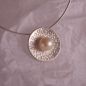 Sterling Silber Perlen Anhänger auf Lederkette. Die feine, lachsfarbene Süßwasserzuchtperle liegt sanft in konkav gewölbter Schale des Anhängers, umgeben von vielen, kleinen Kreisornamenten. Die Schale ist von Hand feinmattiert wobei der Schalenrand abgerundet und poliert wurde. Die Perle, mit Ihrer natürlichen Lachsfarbe und feinem Luster, schimmert in der hellen Perlschale und lenkt alle Blicke auf das Dekolleté.