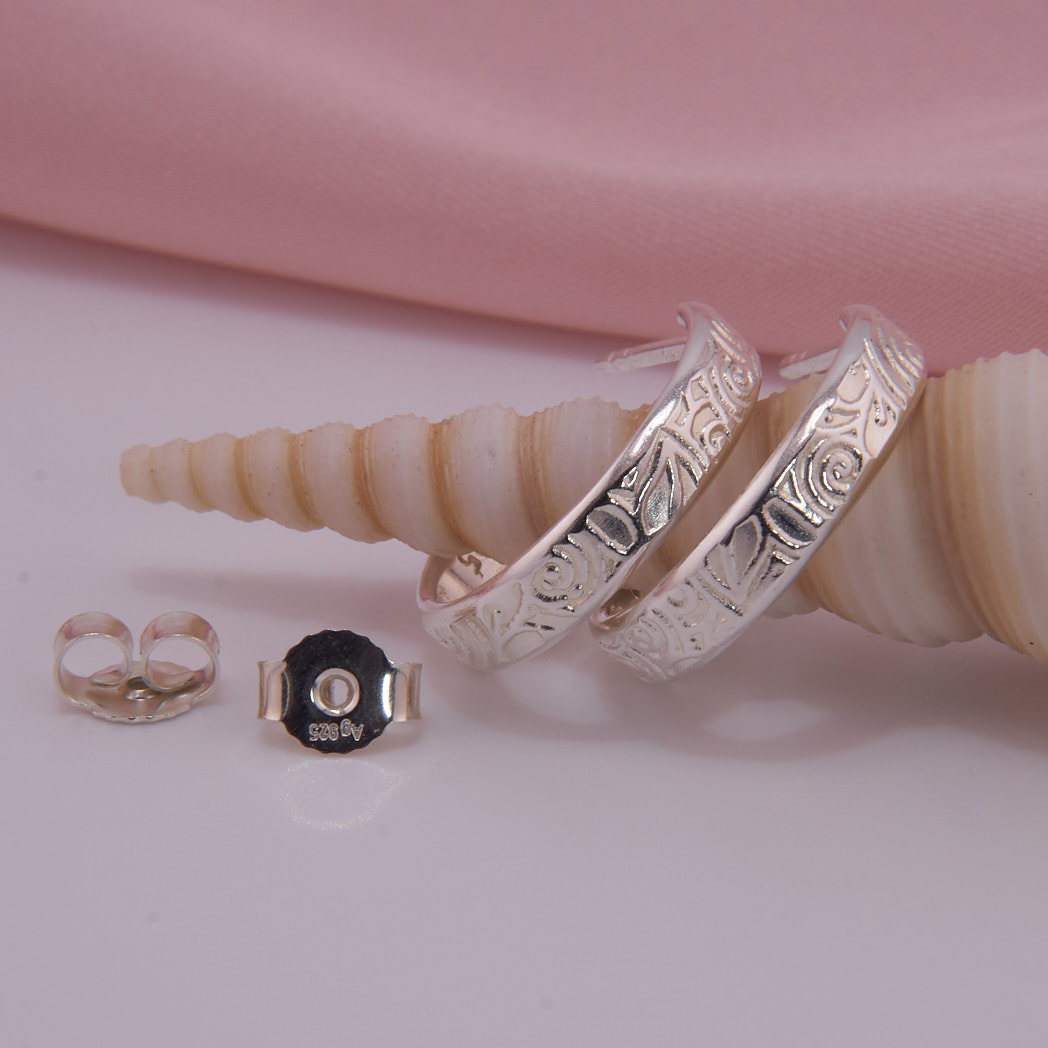 Handgefertigte Halbcreolen aus Sterling Silber, mit Ohrstecker und floralem Walzmuster. Wie feine Spitze legt sich das polierte Walzmuster über die matte Oberfläche der Creolen. Ein feiner Hingucker für eine feminine Trägerin.