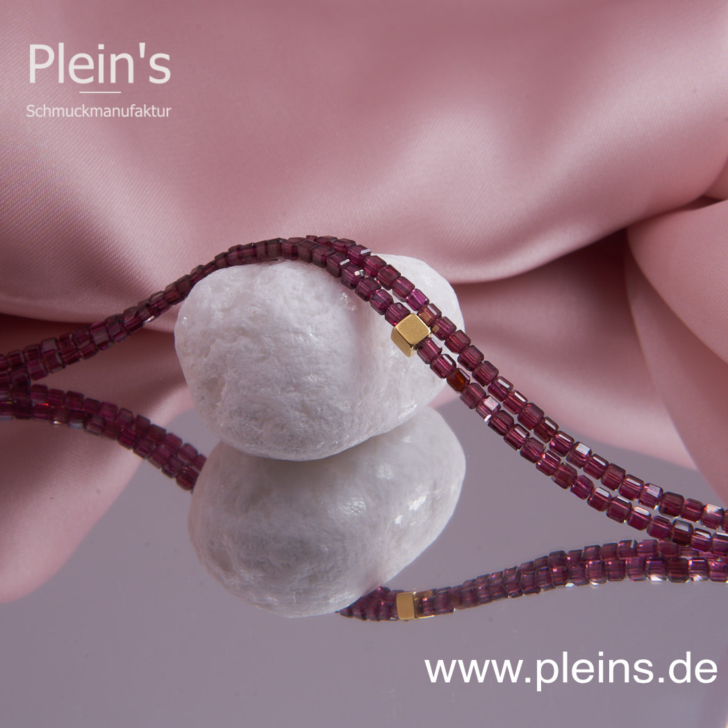 Filigranes Granat Doppel-Armband mit vergoldeten Sterling Silber Verschlüssen und Zwischenteil. Moderne Würfelform der facettierten Edelsteine, warme, weinrot leuchtende Farbe, ein Zwischenteil aus vergoldetem Sterling Silber in Würfelform. Ein minimalistisches Design, temperamentvoll und elegant. Passende Kette finden Sie hier.