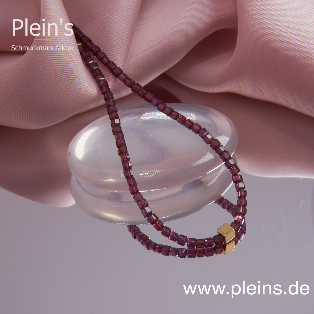 Filigrane Granat Halskette mit vergoldeten Sterling Silber Verschlüssen, Zwischenteil und Verlängerungskette. Moderne Würfelform der facettierten Edelsteine, warme, weinrot leuchtende Farbe, ein Zwischenteil aus vergoldetem Sterling Silber in Würfelform. Ein minimalistisches Design, temperamentvoll und elegant. Auch als Layering Kette geeignet. Passendes Armband finden Sie hier.