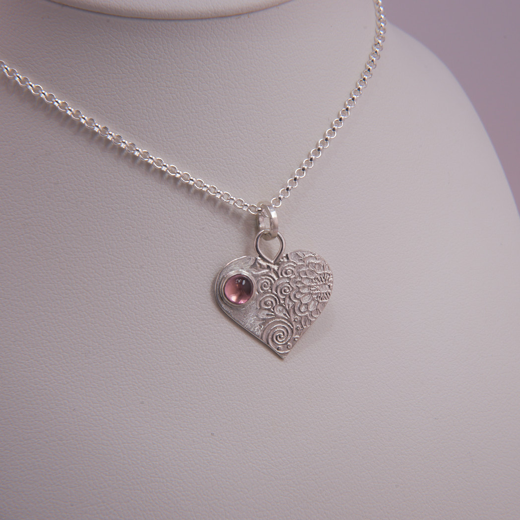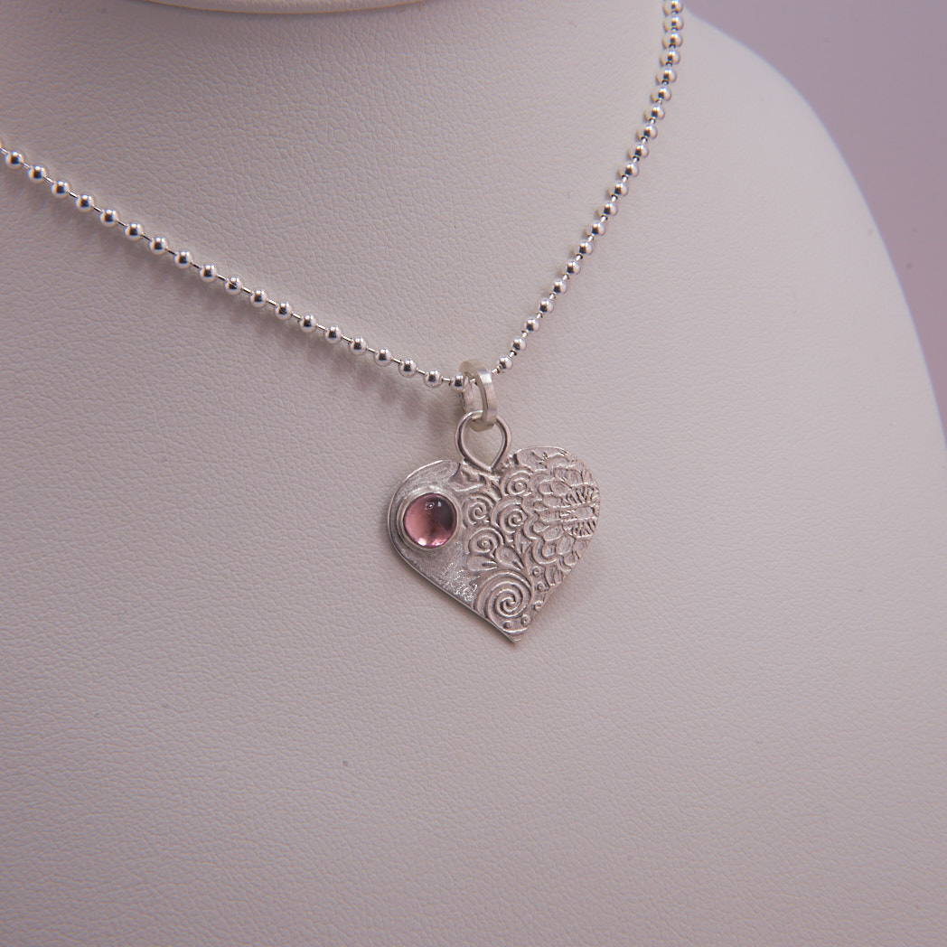 Handgefertigter Sterling Silber Anhänger, Herz mit floralem Muster und seitlich angeordnetem rosa Turmalin Cabochon. Wie feine Spitze legt sich das filigrane Walzmuster über die Hälfte der Herzoberfläche. Ausführung ohne Kette finden Sie hier.