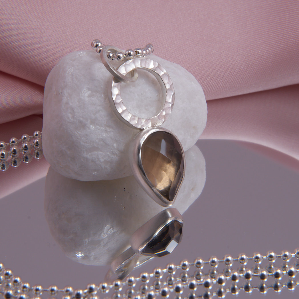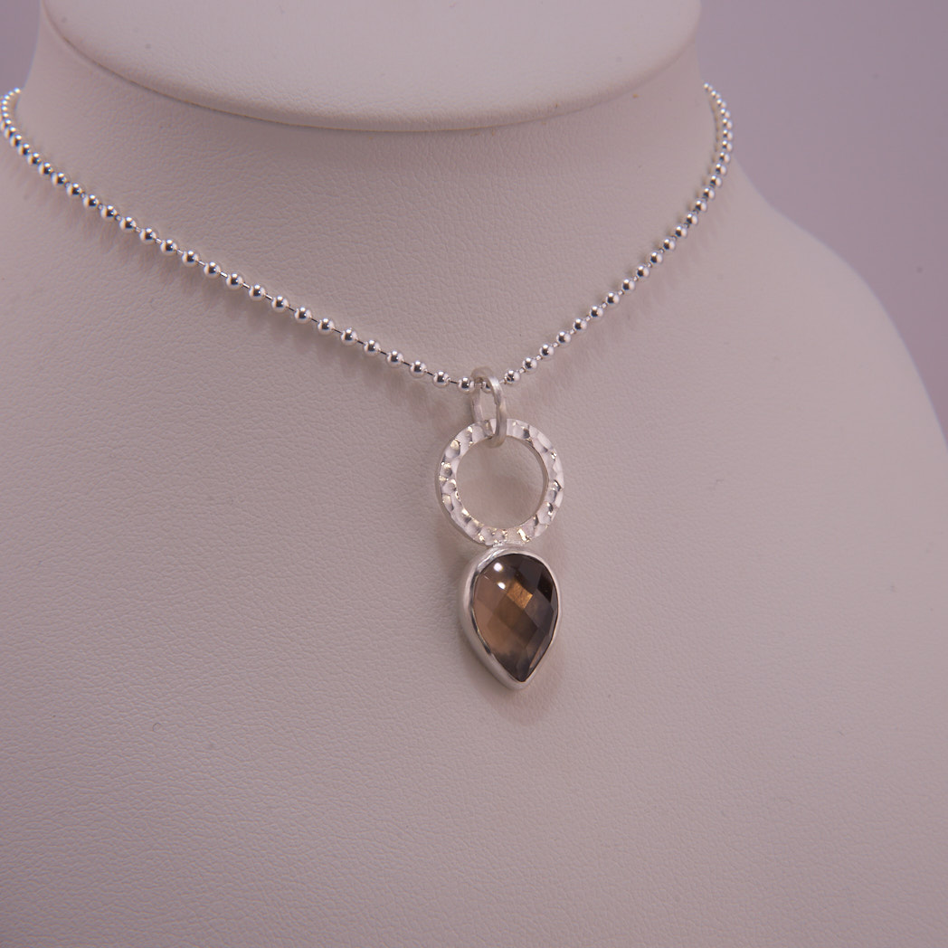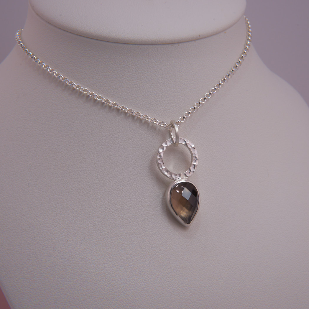 Handgefertigter Sterling Silber Anhänger mit Hammerschlag Struktur und Rauchquarz Tropfen. Ausführung ohne Kette finden Sie hier.
