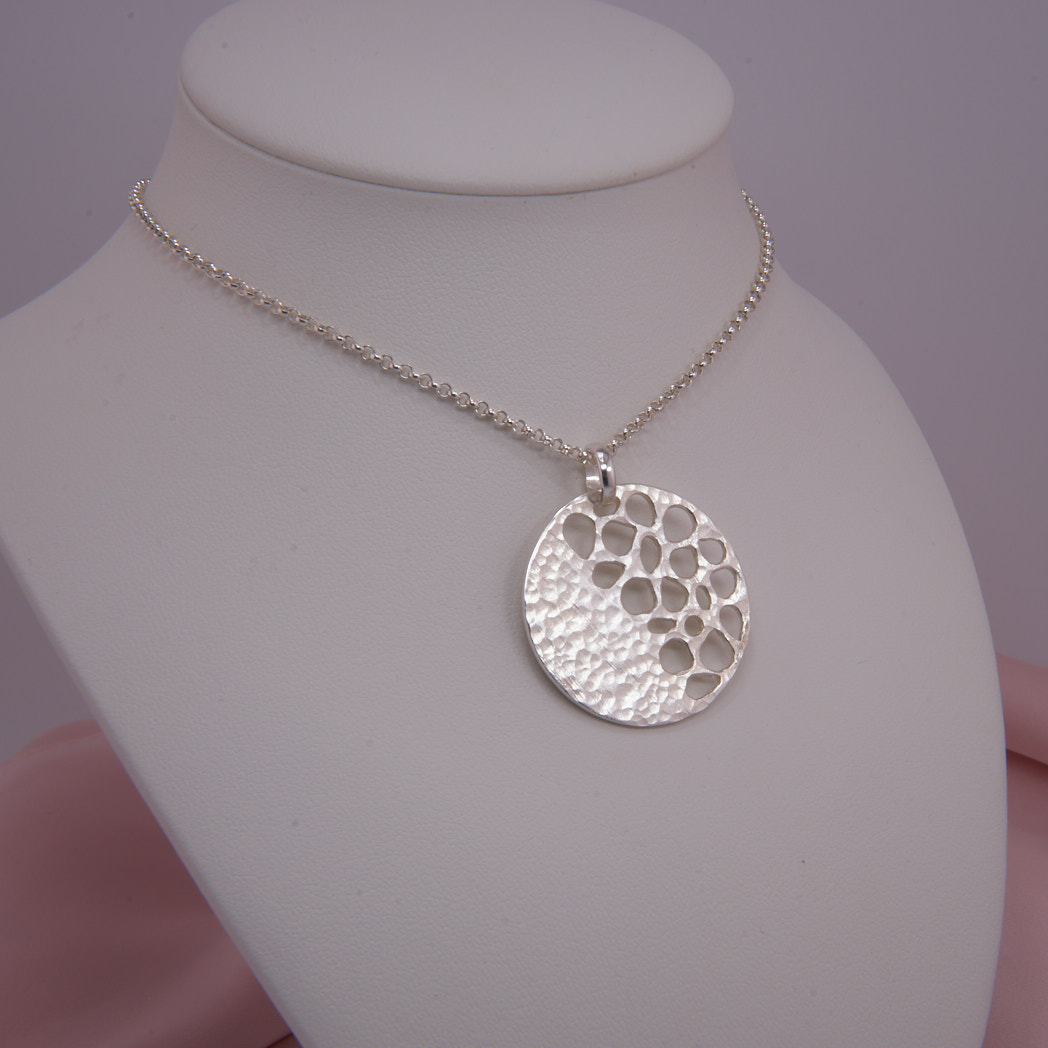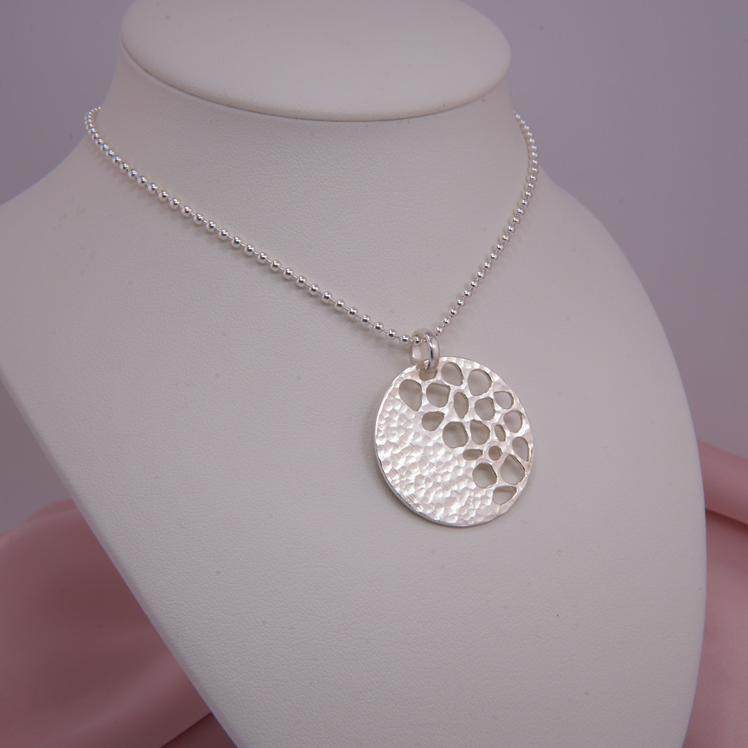Raffinierte, in liebevoller Handarbeit gefertigte Nachbildung der Vorderseite einer Lotus Samenkapsel. Matte, gehämmerte Oberfläche, polierte Kanten der Samenöffnungen und breite Öse vollenden das ungewöhnliche Design. Ausführung ohne Kette finden Sie hier.