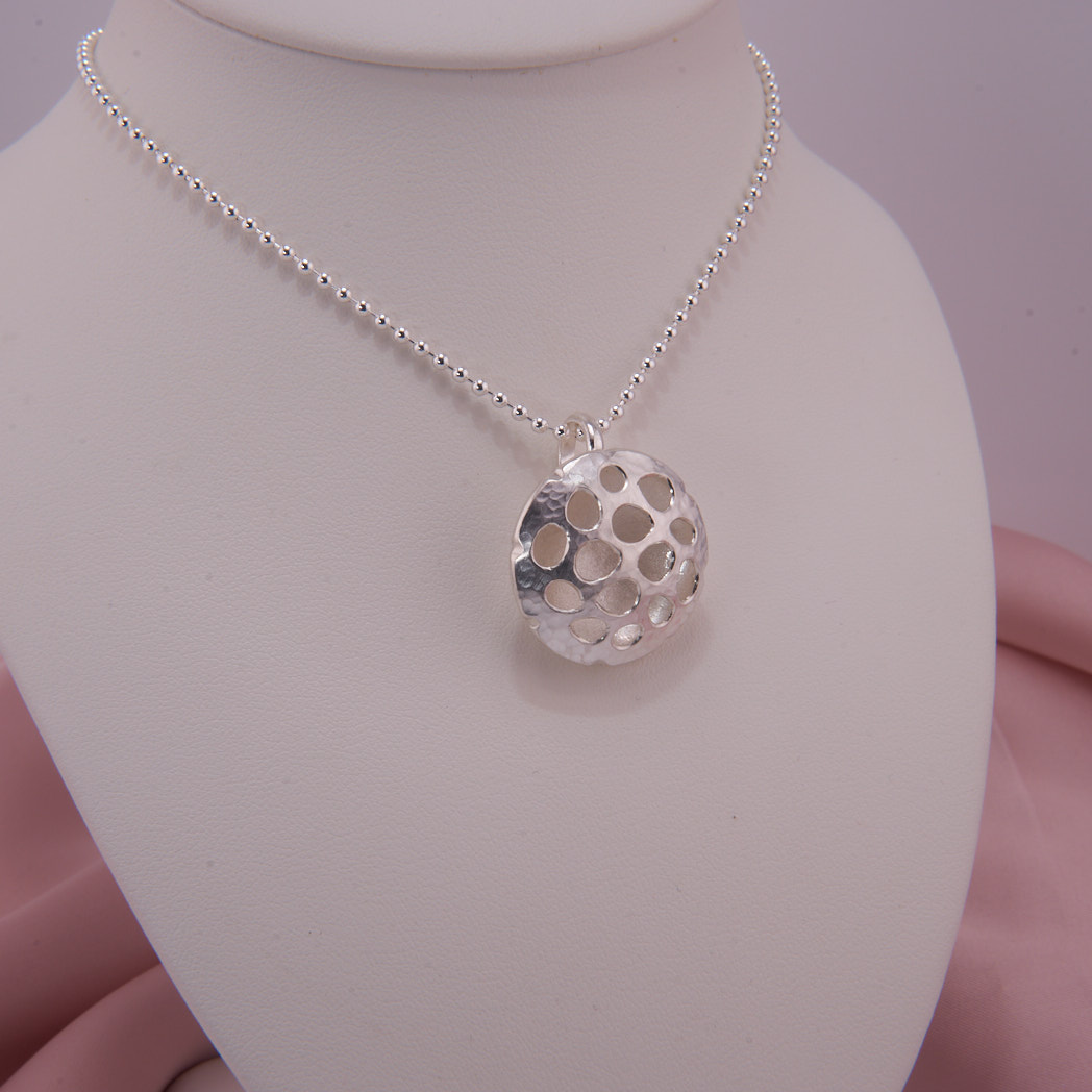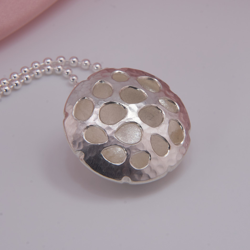 Großer Sterling Silber Anhänger in Form einer Lotus Samenkapsel. Matte, gehämmerte Oberfläche, polierte Rückseite und Kanten verleihen dem Schmuckstück eine einzigartige Optik. Diamantierte Innenseite der Kapsel schimmert fein im Licht und verstärkt die Dreidimensionalität des edlen Schmuckstücks. Große Öse ist auch geeignet für breite Stoffbänder. Sehr schick in Kombination mit einem Dirndl oder auf einer langen Kette. In liebevoller Handarbeit in unserer Werkstatt hergestellt, jedes Stück ist ein Unikat. Ausführung ohne Kette finden Sie hier.