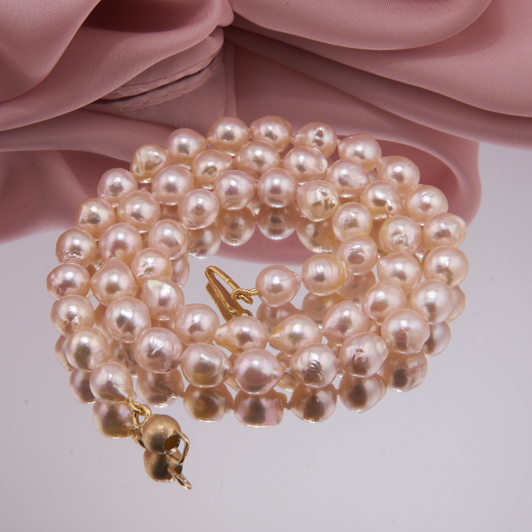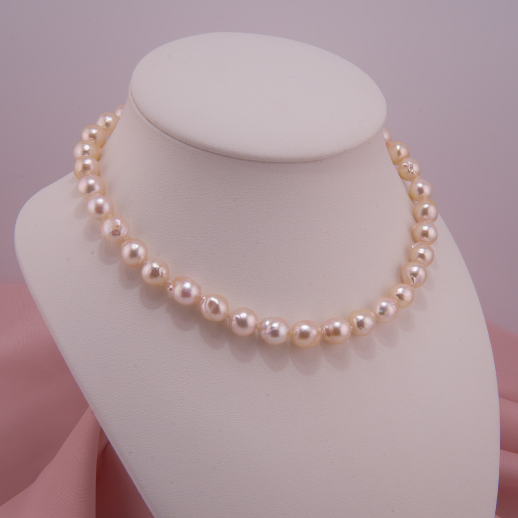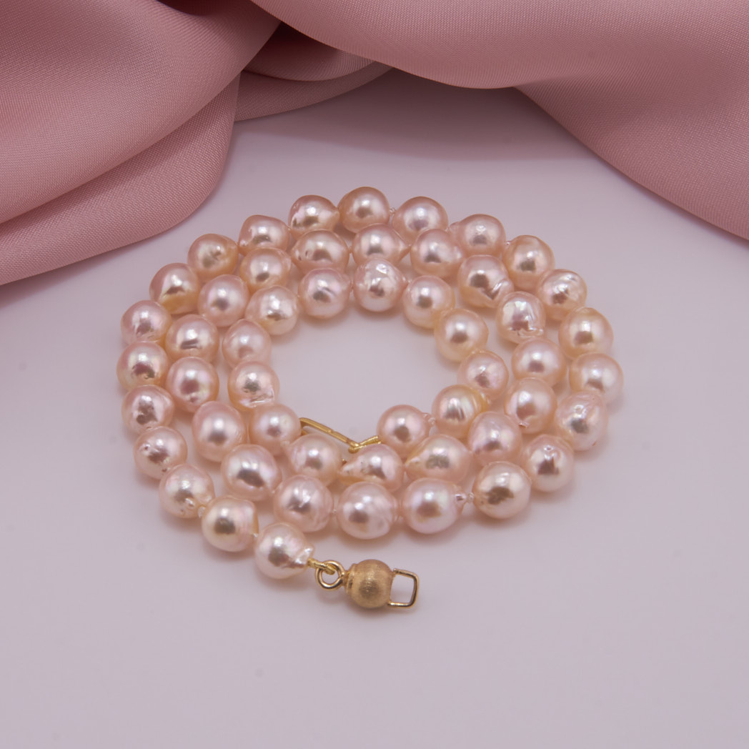 Edle Perlenkette mit vergoldeter Sterling Silber Kugelschließe. 7-8 mm große, weiße Akoya Zuchtperlen, Barock, mit einem sehr schönen Lüster. Handgeknotet in unserer Werkstatt.