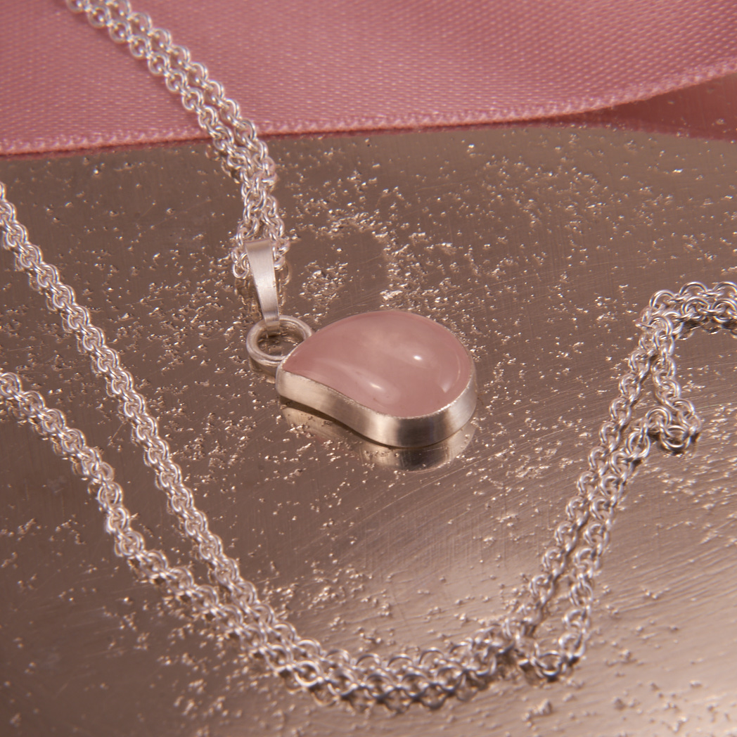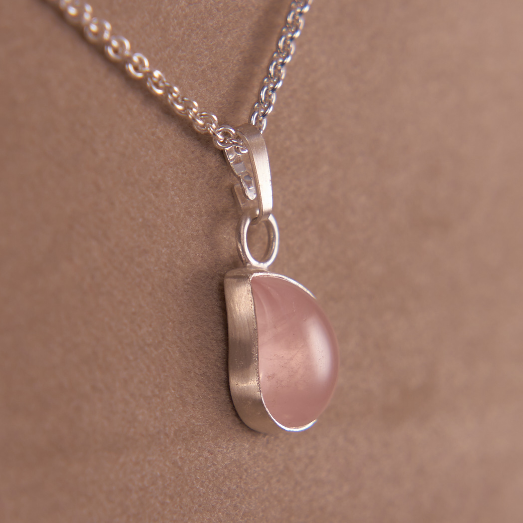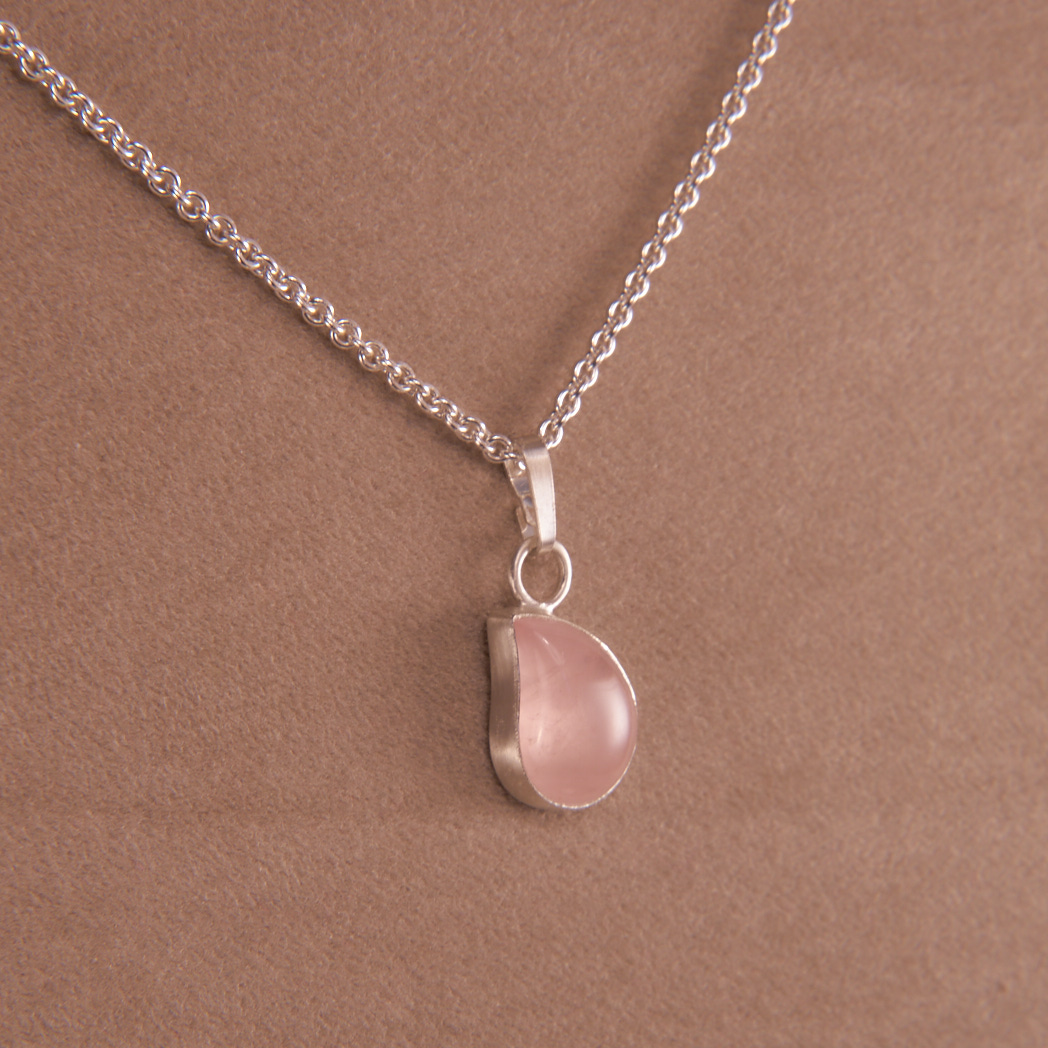Sterling Silber Kette mit einem Rosenquarz Anhänger, in Tropfenform geschliffen und von Hand eingefasst. Zarte Rosafarbe des Edelsteins und die Lichtreflexion unterstreichen die geschwungene Form des Anhängers. Passend zu femininen Frühlings- und Sommer-Outfits.