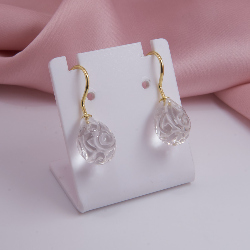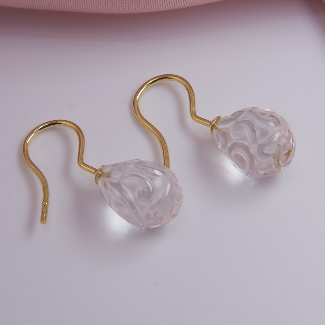 Bergkristall Ohrringe in Tropfenform mit verspielter Gravur. Vergoldete Sterling Silber Ohrhaken.