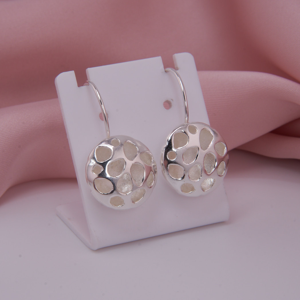Raffinierte, in liebevoller Handarbeit gefertigte Ohrringe aus Sterling Silber. Nachbildung einer Lotus Samenkapsel. Feiner Schimmer im Schaleninneren, polierte Front und Kanten vollenden das außergewöhnliche Design.