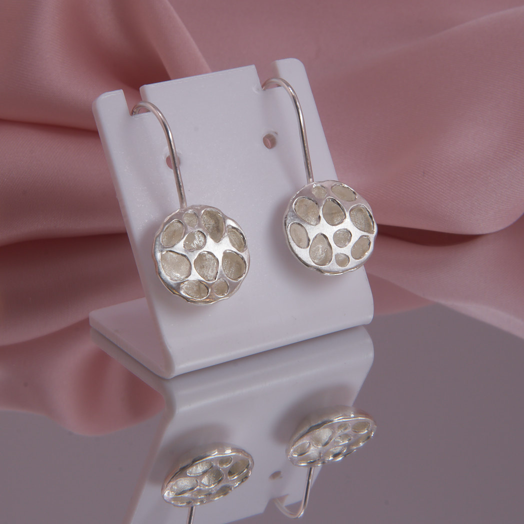 Raffinierte, in liebevoller Handarbeit gefertigte Ohrringe aus Sterling Silber. Nachbildung einer Lotus Samenkapsel. Feiner Schimmer im Schaleninneren, mattierte Front und polierten Kanten vollenden das außergewöhnliche Design.