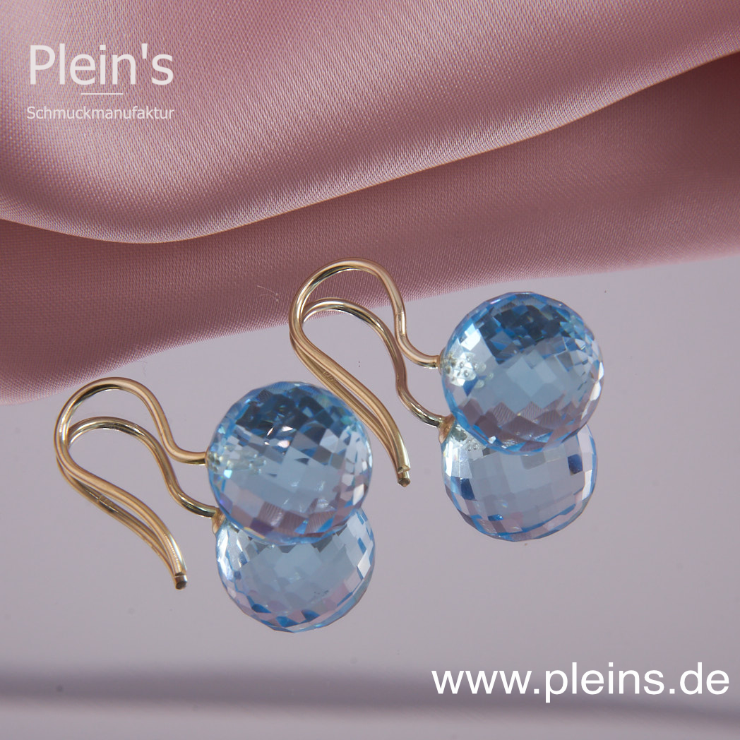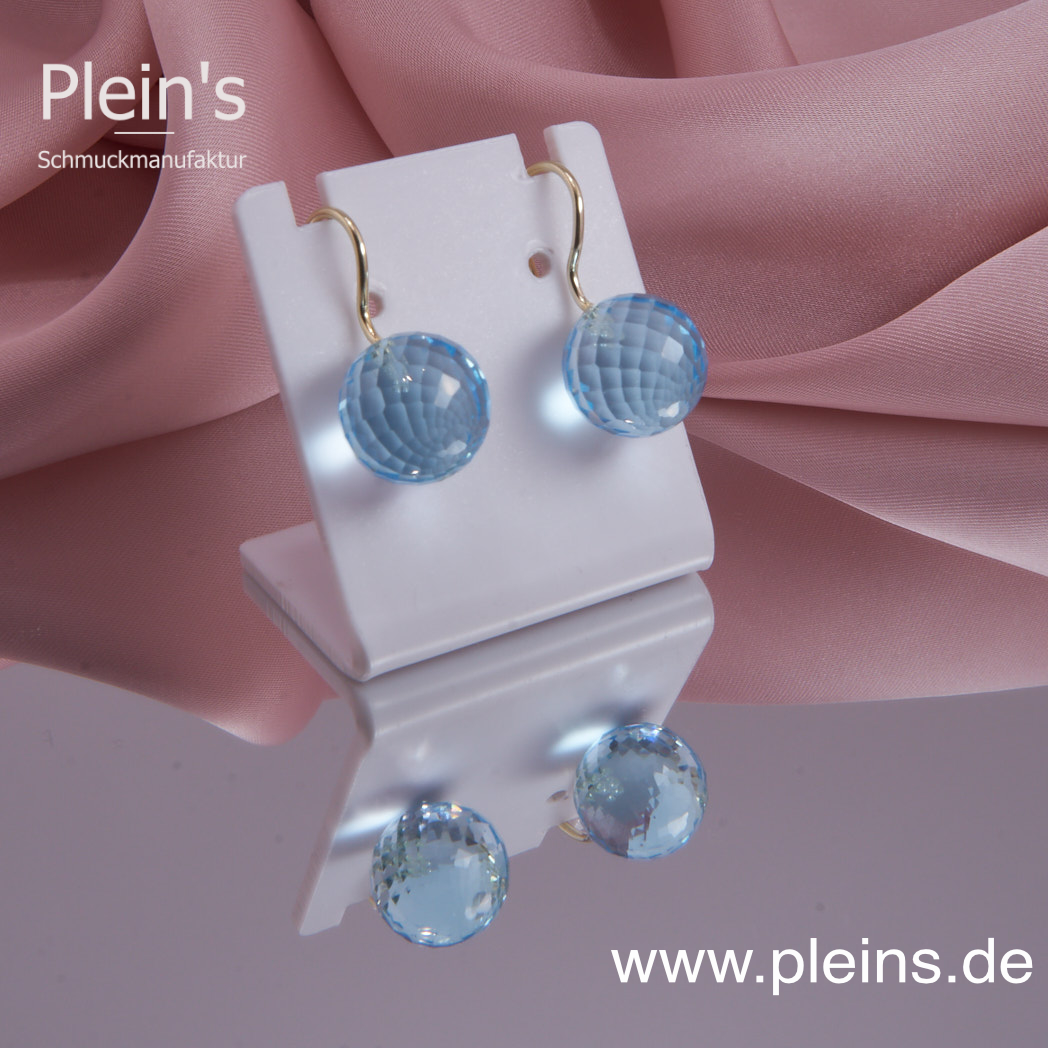 Seltene Gelegenheit - Einzigartige, funkelnde, große Blautopas Kugeln, facettiert und mit 14 Karat Gelbgold Ohrhaken veredelt. Die Edelsteinfarbe trägt den passenden Namen „Sky Blue“ – Edles Hellblau, dessen Farbe an den blauen Himmel erinnert. Ob als täglicher Begleiter oder zu besonderen Anlässen – die Ohrringe sind ein eleganter Hingucker und ein Unikat dazu.
