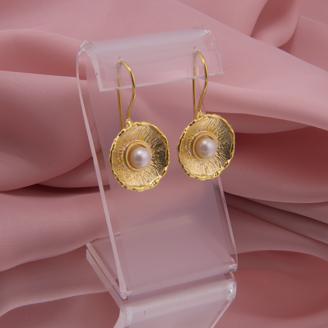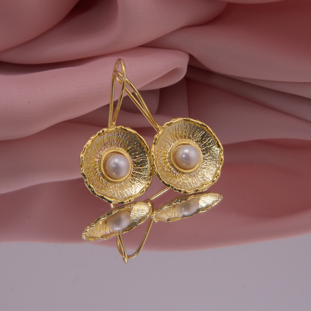 Schöne, vergoldete Sterling Silber Schalen mit mittig angeordneten, weißen Süßwasserzuchtperlen. Geschmolzene Optik der Schalenränder umspielt die einzigartige Oberflächenstruktur und sorgt so für eine strahlende Präsenz.