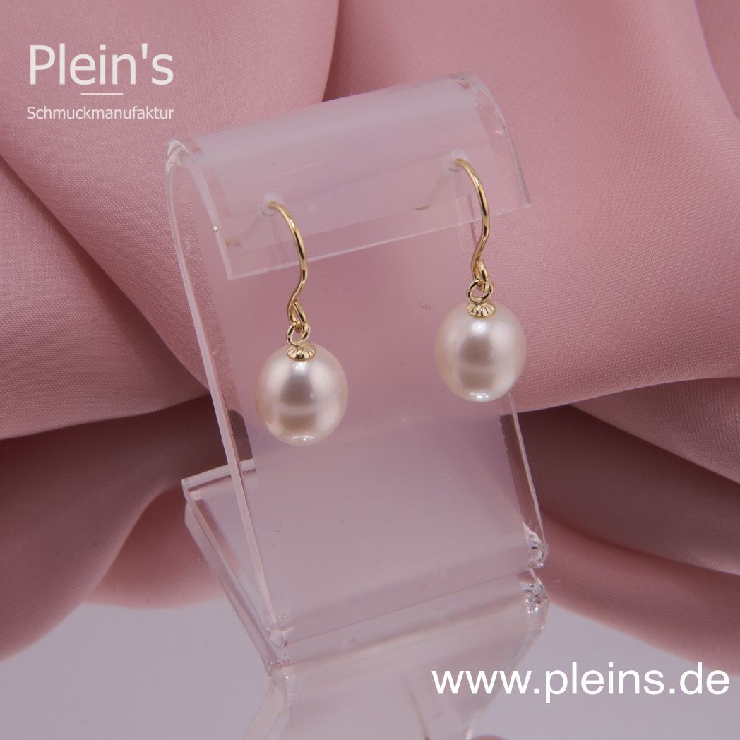 14 Karat Gelbgold Ohrhänger mit wunderschönen, großen, weißen Süßwasser Zuchtperlen. Sehr schöner Lüster reflektiert das Licht der Perlen und sorgt so für einen feinen Schimmer. Zeitlos und edel, und immer wieder begehrter Begleiter im Alltag oder zu besonderen Anlässen.