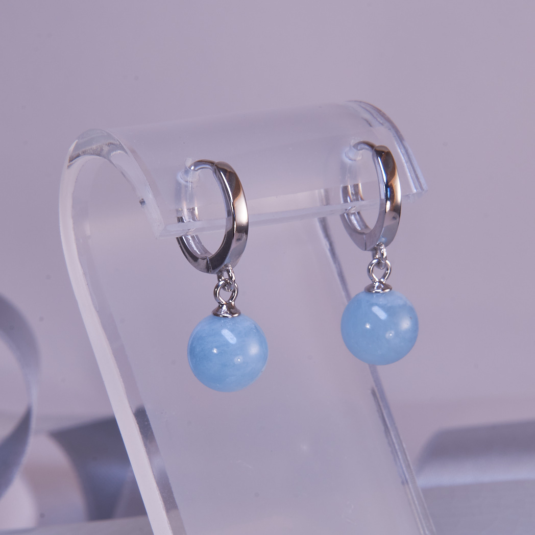 Rhodinierte Sterling Silber Klapp-Kreolen mit blauen Aquamarin Kugeln. Moderne, stylische Alltagsbegleiter.