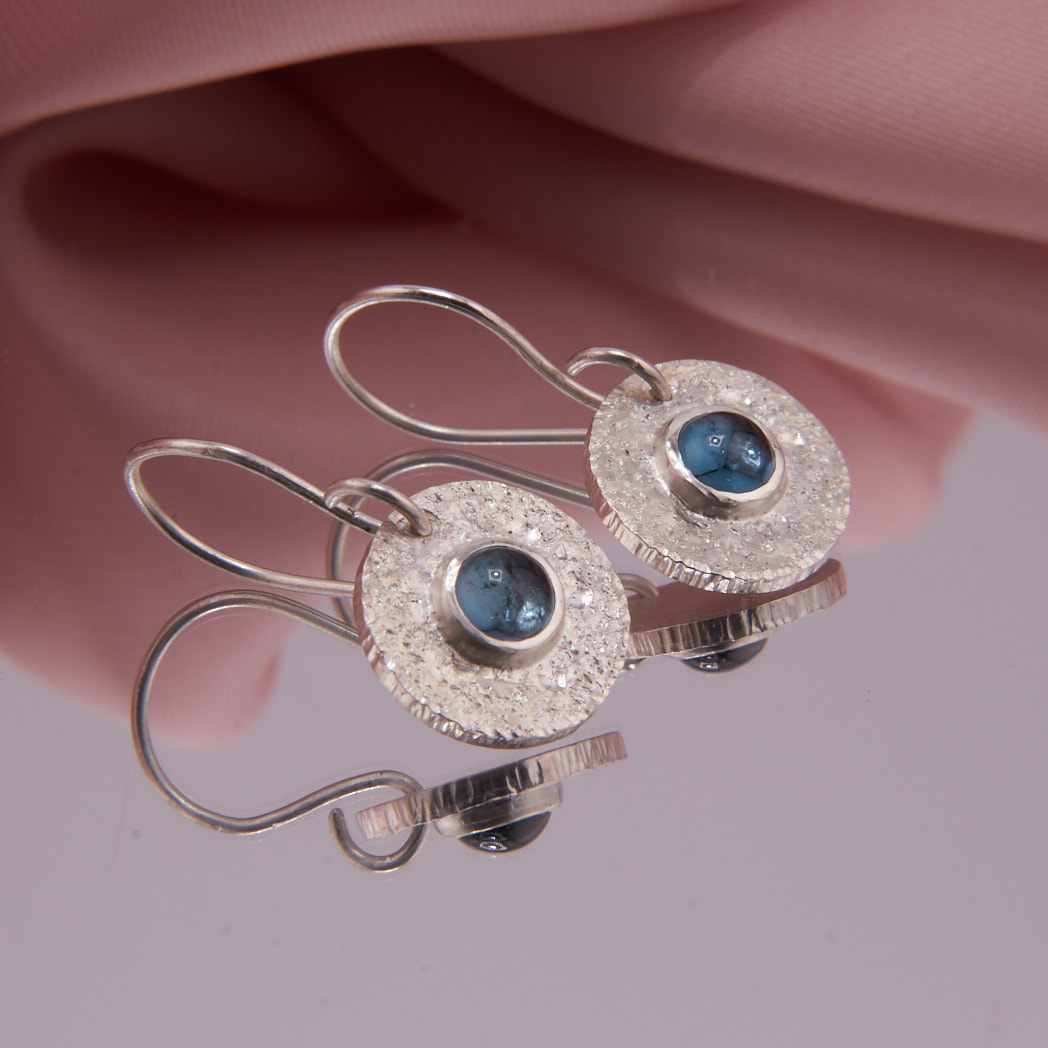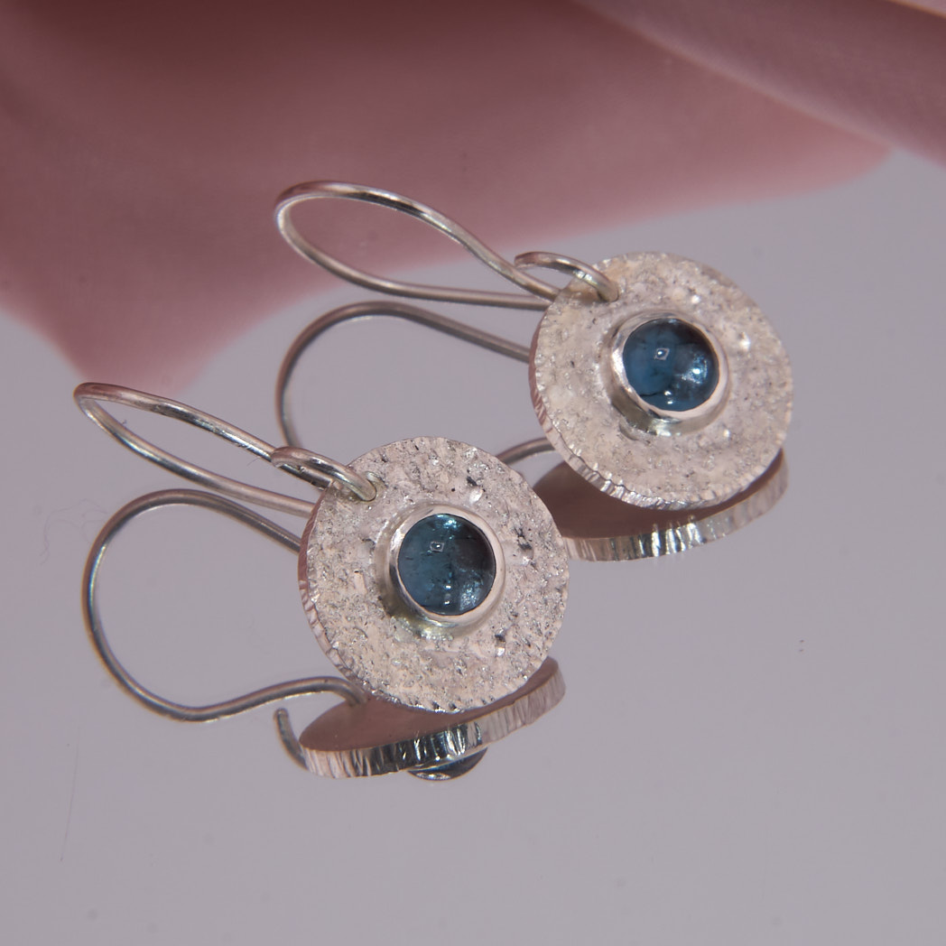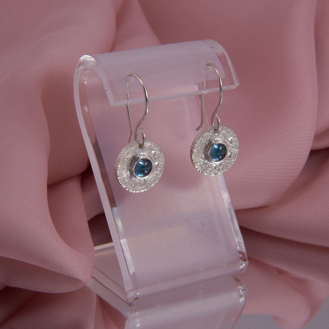 Sterling Silber Ohrhänger mit Blautopas Cabochons und einer Länge von ca. 25 mm. Die ungewöhnliche Oberflächenstruktur der Silberronde reflektiert das Licht bei jeder Bewegung. Verstärkt wird die Wirkung durch dunkelblaue, 5 mm breite Topase. Das frische und moderne Jeansblau ist vielseitig kombinierbar und perfekt passend zu jedem Casual Outfit.