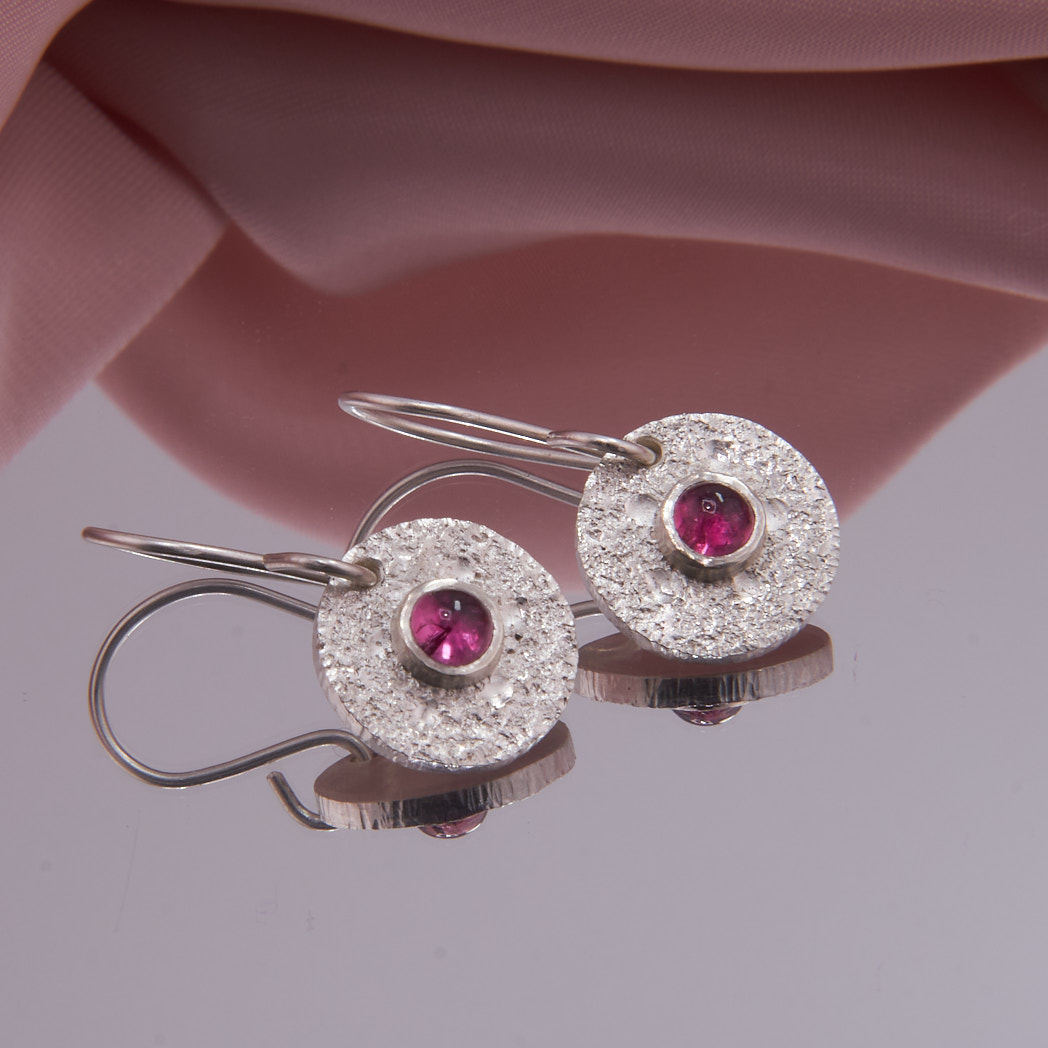Sterling Silber Ohrhänger mit Turmalin Cabochons und einer Länge von ca. 25 mm. Die ungewöhnliche Oberflächenstruktur der Silberronde reflektiert das Licht bei jeder Bewegung. Verstärkt wird die Wirkung durch pinkfarbene, 4 mm breite Turmaline. Das frische und moderne Himbeerrot ist vielseitig kombinierbar und perfekt passend zu jedem Casual Outfit.