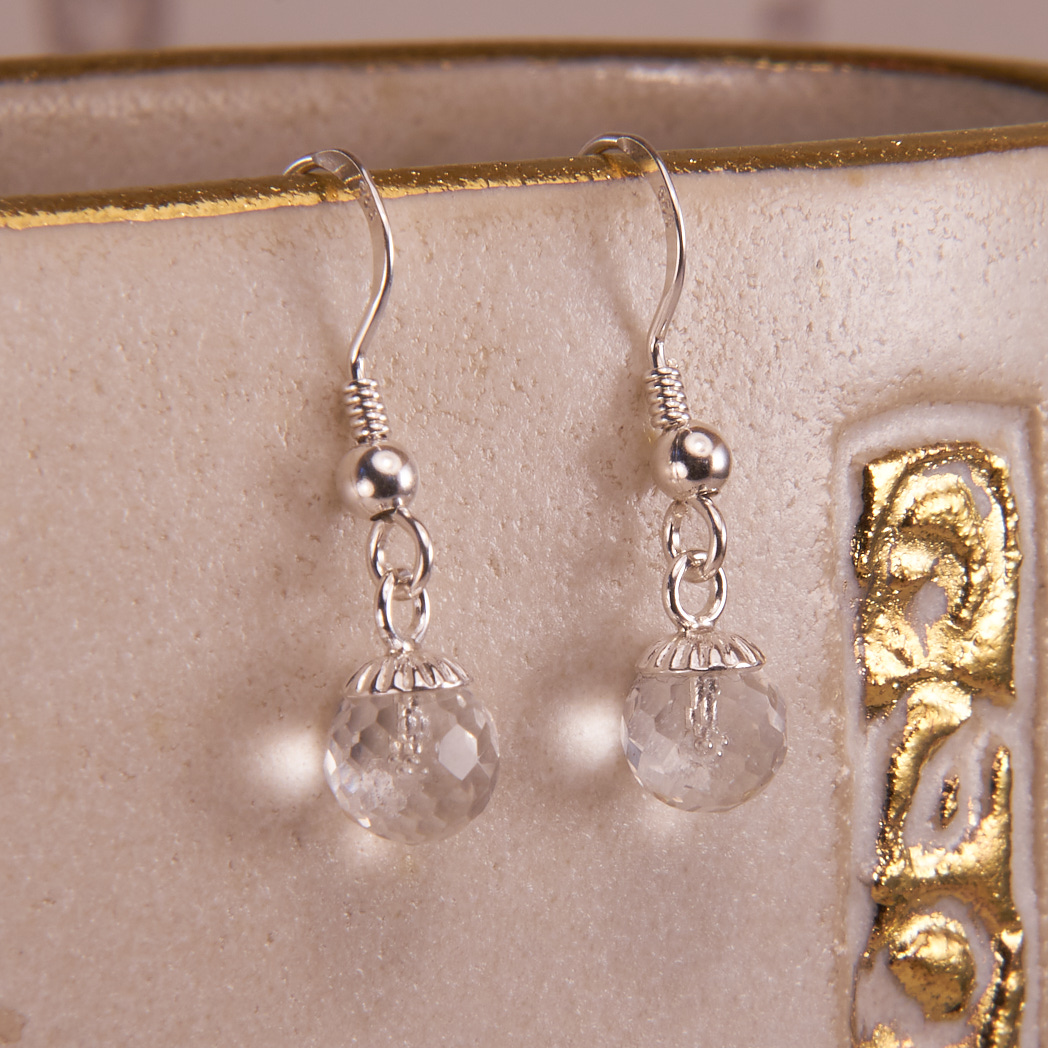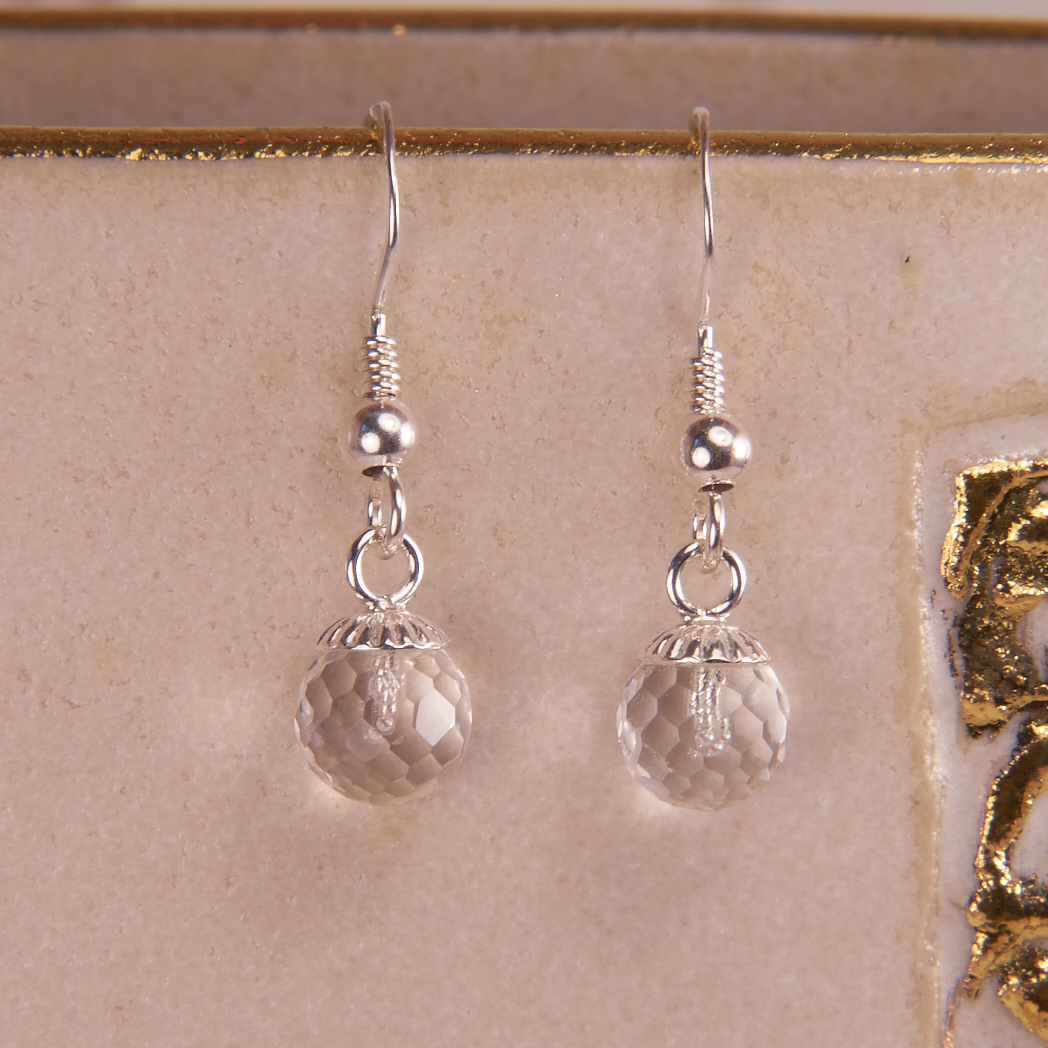 Filigrane Sterling Silber Ohrringe mit facettierten Bergkristallen. Bei jeder Bewegung bricht sich das Licht in den Facetten der 6 mm großen Bergkristallkugeln. Neutral gehalten passen die Ohrringe zu fast jedem Outfit.