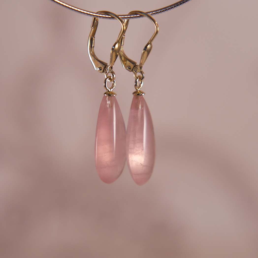 Zarte, feminine Linsen-Ohrringe mit Rosenquarz, in 585 Gelbgold vergoldeten Silber-Brisuren eingefasst. Sehr schöne, wolkige Innenstruktur der Edelsteine verleiht den Ohrringen eine besondere Note. Die Edelsteine sind in Form einer Linse/Birne geschliffen und sie haben eine Größe von ca. 20 x 10 mm. Gesamtlänge des Ohrrings beträgt ca. 35 mm. Die Ohrringe passen schön zu einem Boho Style Outfit.