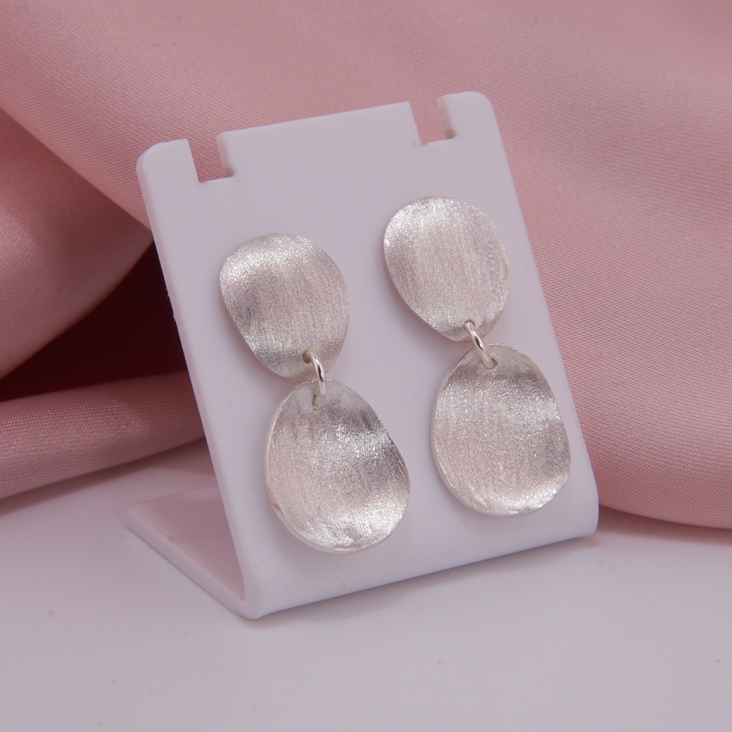Sterling Silber Ohrstecker mit hängenden, unregelmäßig geformten Plättchen. Diese Ohrstecker sind mehr als nur Accessoires – sie sind ein Statement für Individualität. Die bewusst unregelmäßige Form bricht mit klassischen Konventionen und mach jedes Paar zu einem Ausdruck Ihrer Persönlichkeit. Das schimmernde Finish bringt eine dezente Portion Glamour in den Alltag.