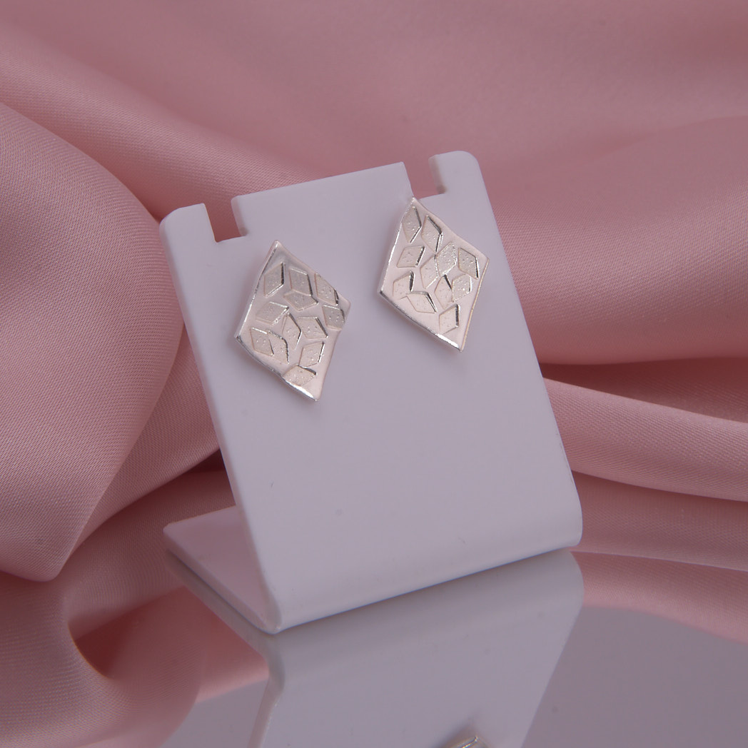 Handgefertigte Sterling Silber Ohrstecker in Form einer Raute, mit geometrischem Muster. Zufällig angeordneten Karos umspielen die leicht gebogene Oberfläche der Ohrstecker und ergeben so eine einzigartige Formgestaltung.