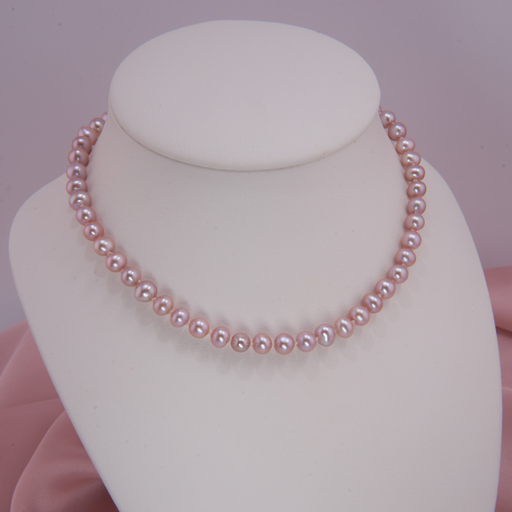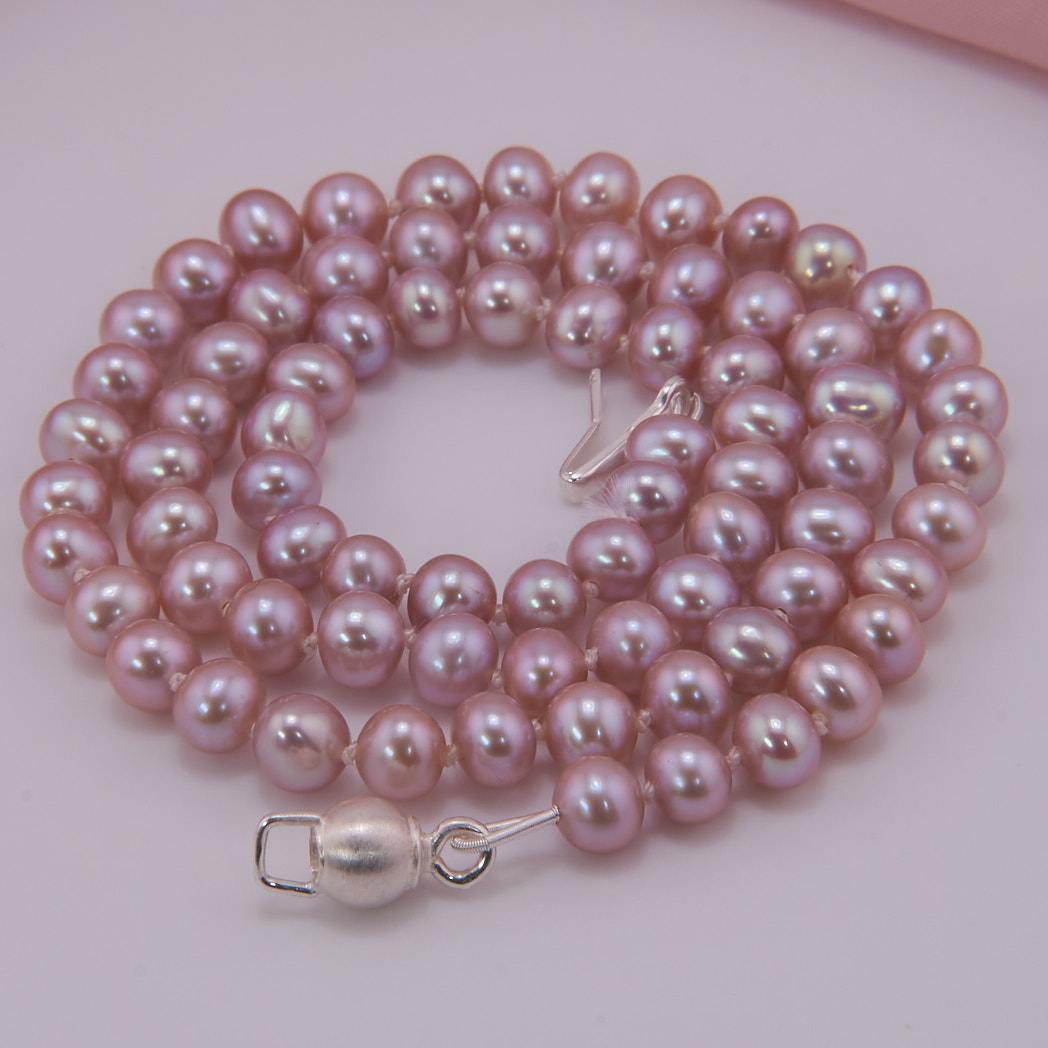 Elegante Süßwasser Perlenkette mit Sterling Silber Steckverschluss. Ovale, lavendelfarbene Perlen mit einem schönen Schimmer. Handgeknotet in unserer Werkstatt.
