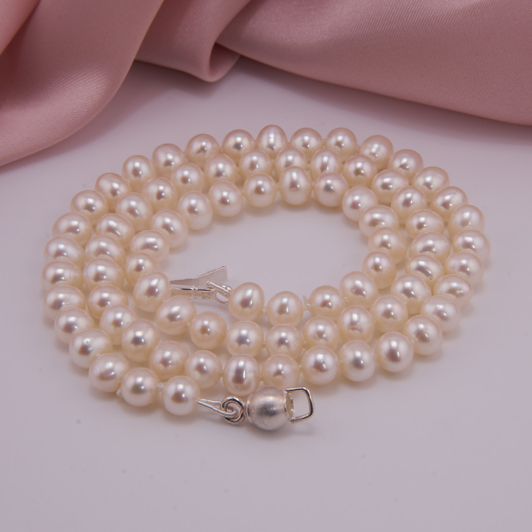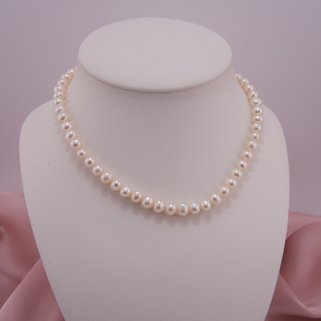 Edle Süßwasser Perlenkette mit Sterling Silber Steckverschluss. Ovale, weiße Perlen mit einem schönen Schimmer, passend für fast jede Gelegenheit. Handgeknotet in unserer Werkstatt.
