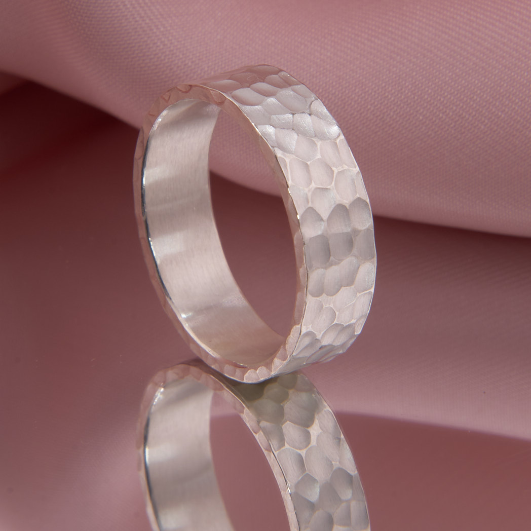 Bandring aus Sterling Silber mit Hammerschlagstruktur. Aufwendig behandelte Oberfläche unterstreicht die Form der Hammerschläge. Die Innenseite des Rings ist mattpoliert. Die Innenkanten der Ringschiene sind für besseren Tragekomfort leicht abgerundet. Ideales Geschenk zum Jahrestag, Geburtstag, oder als Freundschaftsring.