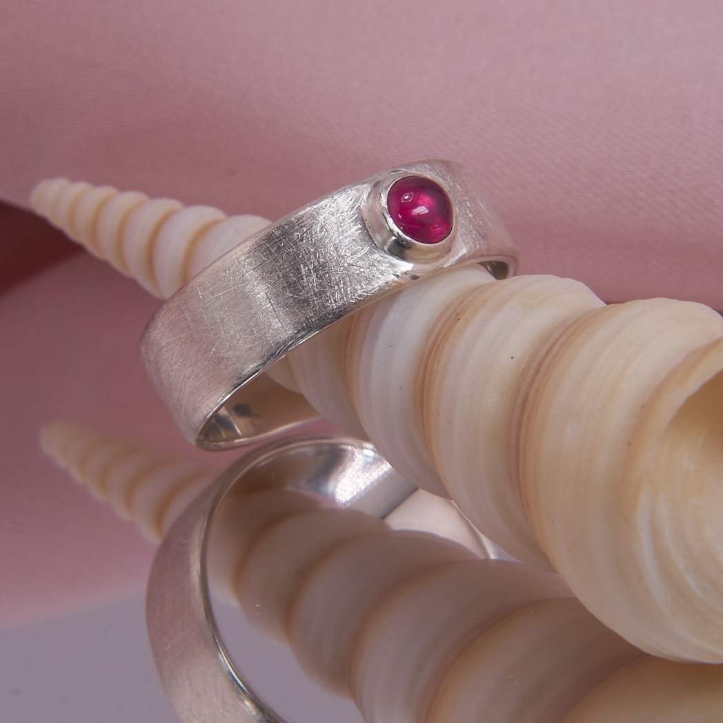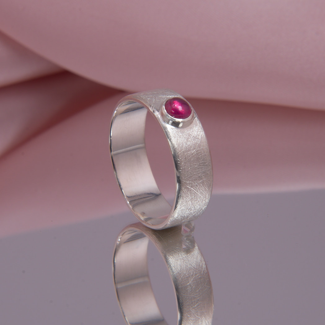 Material: Silber Legierung: 925 Ringbreite: ca. 6 mm Edelstein: Rubin, rot, Cabochon rund, ø 4 mm, behandelt