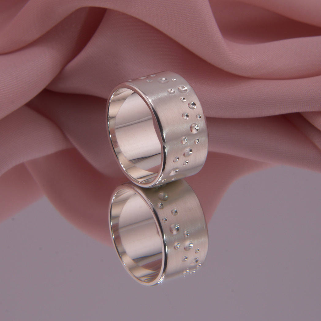 Breiter Sterling Silber Ring mit feinmatter Oberfläche, abgerundeten Kanten und einem Wellenmuster aus vielen unterschiedlich großen Vertiefungen. Bei Lichteinfall strahlen die polierten Vertiefungen das Licht zurück und erzeugen so eine Edelstein ähnliche Lichtreflexion. Innenseite des Ringes ist hochglanzpoliert. Ideales Geschenk zum Jahrestag, Geburtstag, oder als Freundschaftsring.