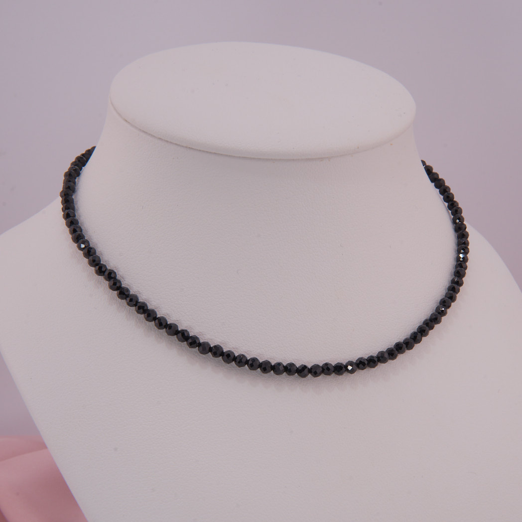 Schwarze Spinell Kette mit vergoldeten Sterling Silber Verschlüssen und Verlängerungskette. Funkelnde, facettierte Spinell Kugeln und die tiefschwarze Farbe der Edelsteine in Kombination mit sonnig warmer Vergoldung, für eine temperamentvolle, elegante Trägerin.